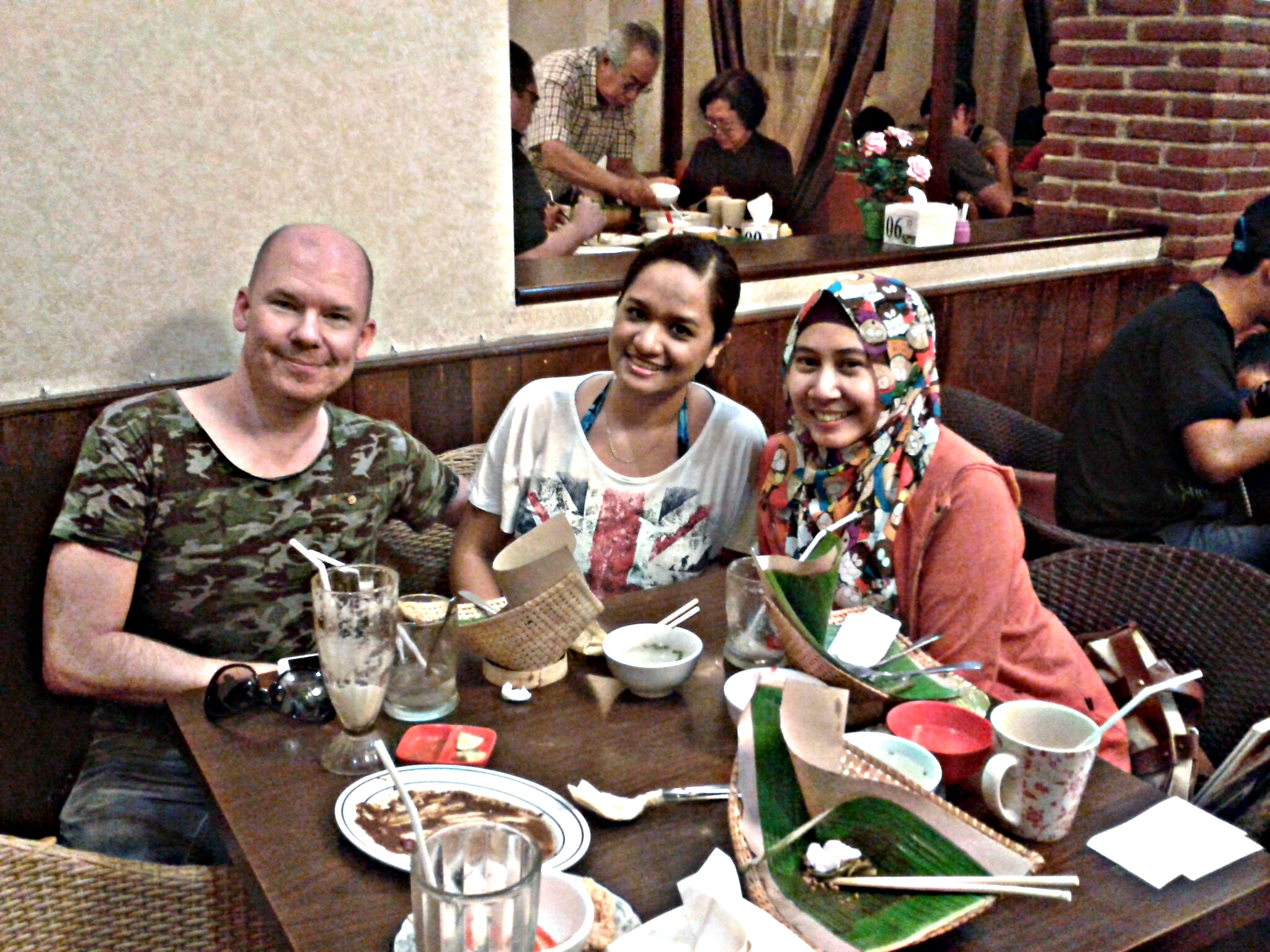 Berhubung saya juga dateng sama si Bebeb, tadinya yang ngobrol cuma saya sama mbak Cha aja, ngobronya pun seputar dunia perblogging-an beserta blogger-bloggernya. Bebeb sama Om Miku cuma nontonin kita ngobrol, jadi awkward banget π Tapi lama-lama obrolan juga mengalir seputar daily life jadinya semua ikutan ngobrol. Karena mbak Cha jago bahasa Swedia, sementara kami gak bisa, jadi ngobrolnya pun campur-campur bahasa Indonesia – Inggris – Swedia. Om Miku ini lucu banget, dan ternyata dia suka sama makanan Indonesia. Pasti karena tiap hari dimasakin makanan Indonesia sama mbak Cha. Oiya berhubung besoknya ada acara karnaval ulang tahun Arema, Om Miku juga gak mau ketinggalan, dia udah siap mau jalan-jalan pake T-shirt Arema besok, waaahh kereeen! Abis itu ngobrolnya terpaksa stop sementara karena makanan kita udah dateng, laper sik jadi mau fokus makan π