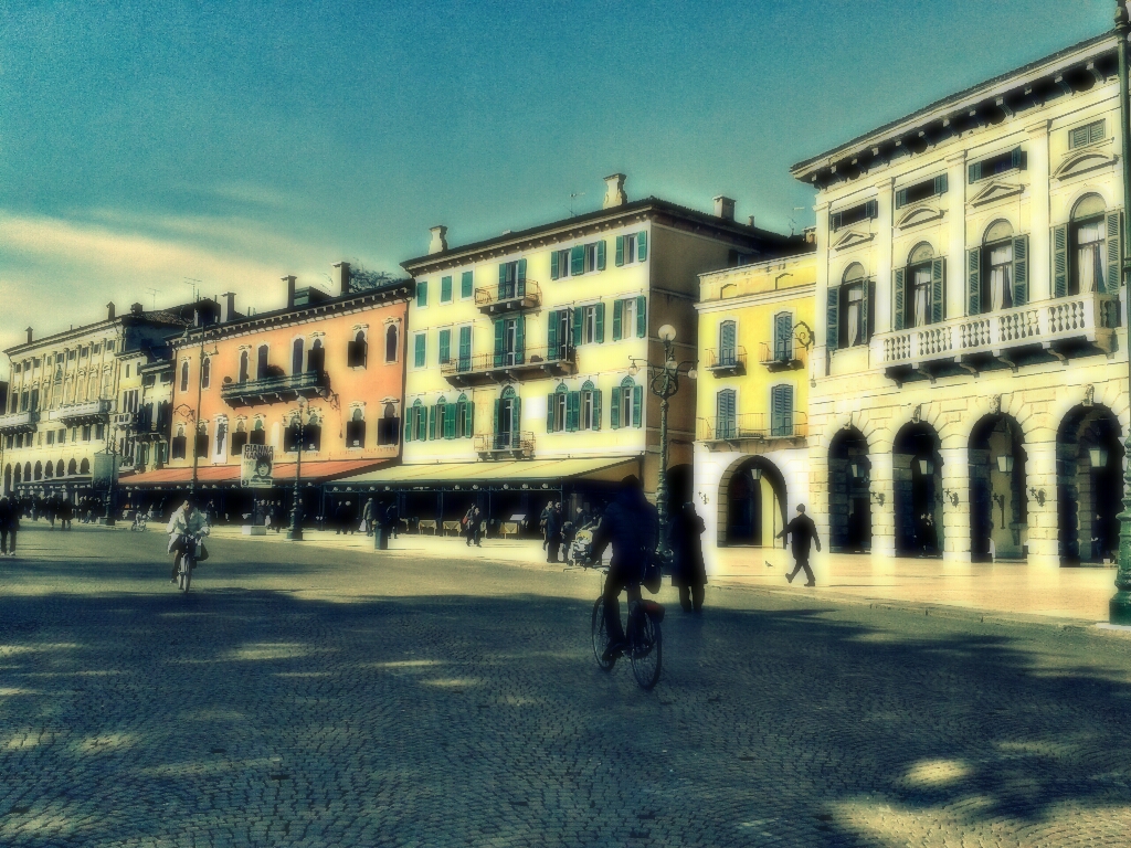 Sebenernya saya gak terlalu lancar mengendarai sepeda. Kadang masih suka oleng dan mau jatoh gitu, apalagi kalo sepedanya tinggi. Kayaknya sih saya emang agak bermasalah sama keseimbangan (termasuk keseimbangan hidup), jangankan naik sepeda wong jalan kaki aja kadang masih suka kesandung dan nabrak-nabrak apalagi kalo ada cowok cakep. Tapi demi menghemat ongkos transportasi dan kebetulan dipinjemin sepeda sama owner B&B di Verona, akhirnya ada hari dimana saya nekat bersepeda keliling kota Verona bareng mas Bebeb.
