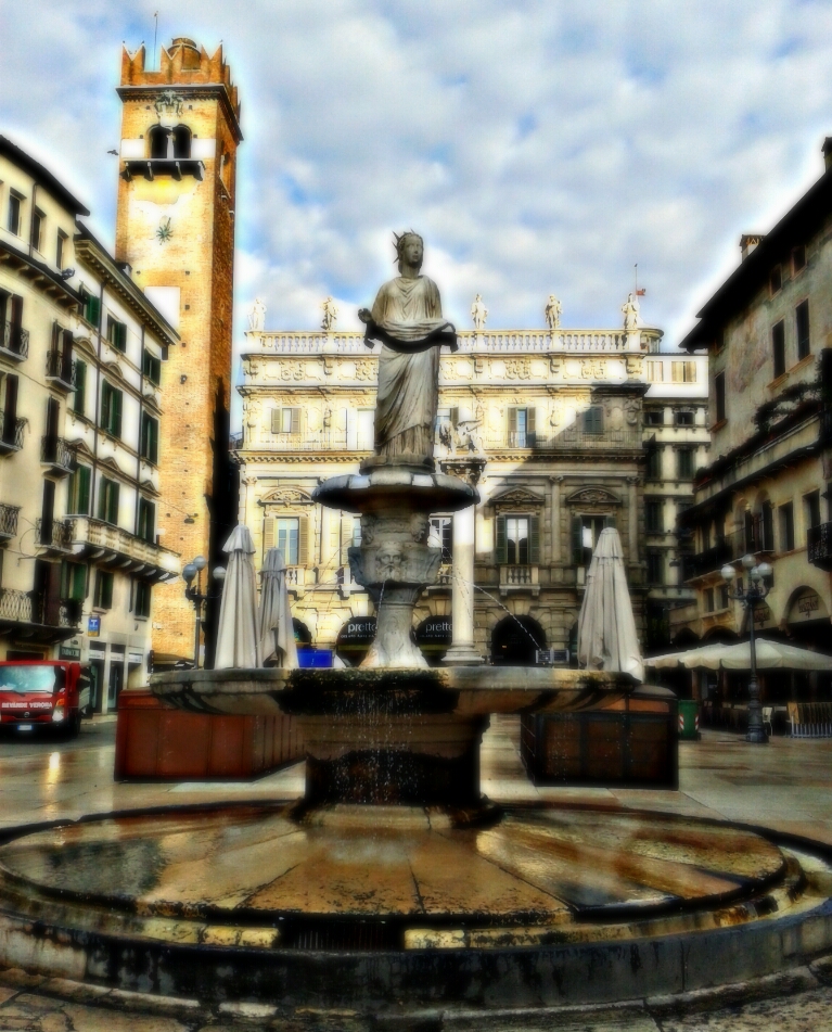 Alhamdulillah pagi itu cuaca Verona lagi cerah banget dengan langit biru dan suhu sekitar 10 derajat celcius, bener-bener cuaca yang pas untuk angon bebek bersepeda. Naik sepedanya iring-iringan sama mas Bebeb, soalnya dia sambil baca peta dan saya pasrah mbuntuti dari belakang. Kami menuju Piazza Erbe yang merupakan square/alun-alun besar tempat orang-orang Verona berkumpul dan bersantai karena banyak bar dan resto. Kami parkir sepeda disana terus jalan-jalan di sekitar Piazza Erbe. Disini juga banyak yang jual souvenir, saya sempet beli beberapa tempelan kulkas dan gantungan kunci.