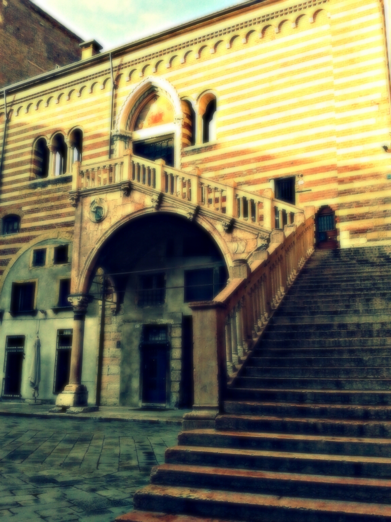 Karena batal maen ke rumah dan elus-elus tetek Juliet, kami jalan menuju sebuah bangunan megah bernama Palazzo Della Ragione. Kalo gak salah sih ini istana yang dulunya merupakan pusat kekuatan politik Verona. Yang paling iconic disini adalah tangganya yang unik dan gothic yang lebih dikenal dengan Scala della Ragione atau Reason Stairs.