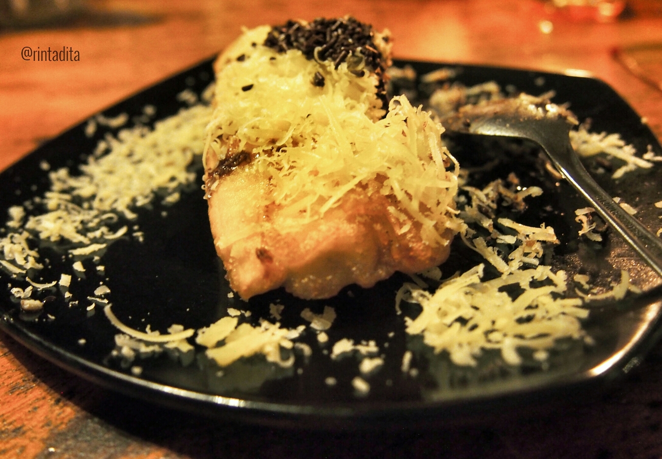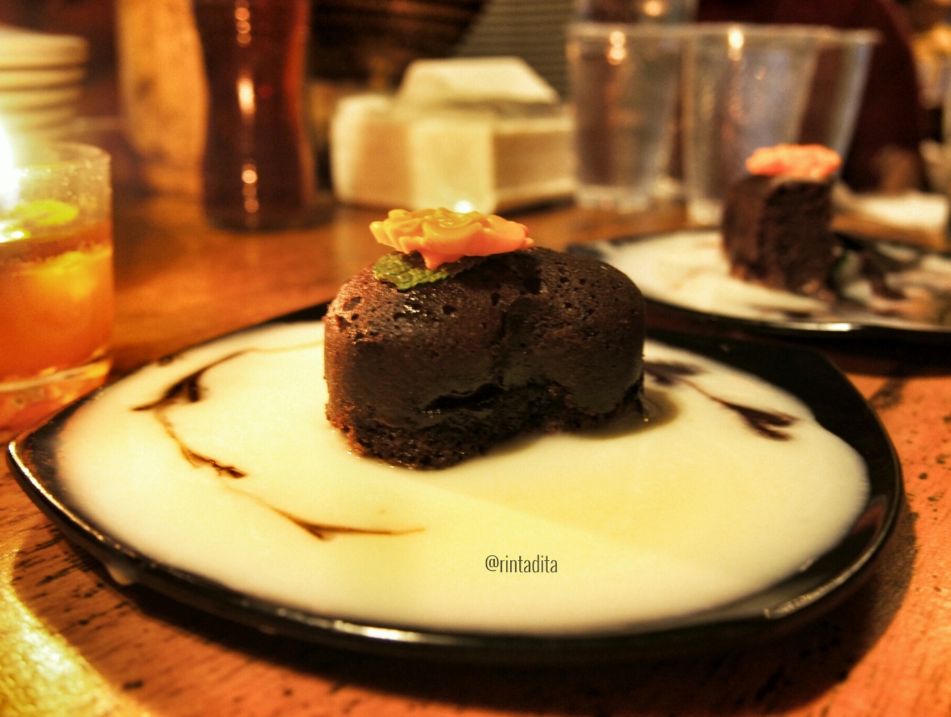 Selesai sholat kami balik lagi ke gubug dan alangkah senangnya ternyata udah ada deretan sajian dessert yang nangkring manis di meja. Ada Lava cake, Galunggung Kabeuleum dan pisang goreng keju. Paling unik memang Galunggung Kabeuelum ini, artinya kurang lebih Gunung Galunggung Meletus gitu bukan?! Tolong akang-eneng yang asli Sunda, ini dibenerin kalo salah ya 😀 Si Gunung meletus ini terdiri dari whip cream dengan roti terus dibakar menggunakan blow torch. Saya cuma nyicipin dikit sih soalnya gak terlalu suka whip cream, jadi saya “cuma” ngabisin pisang goreng kejunya yang renyah dengan keju parut yang melimpah.