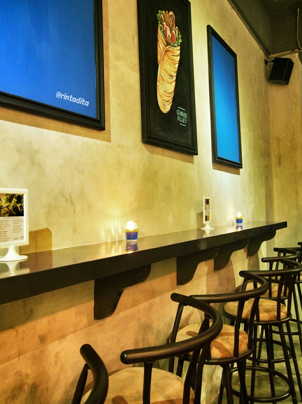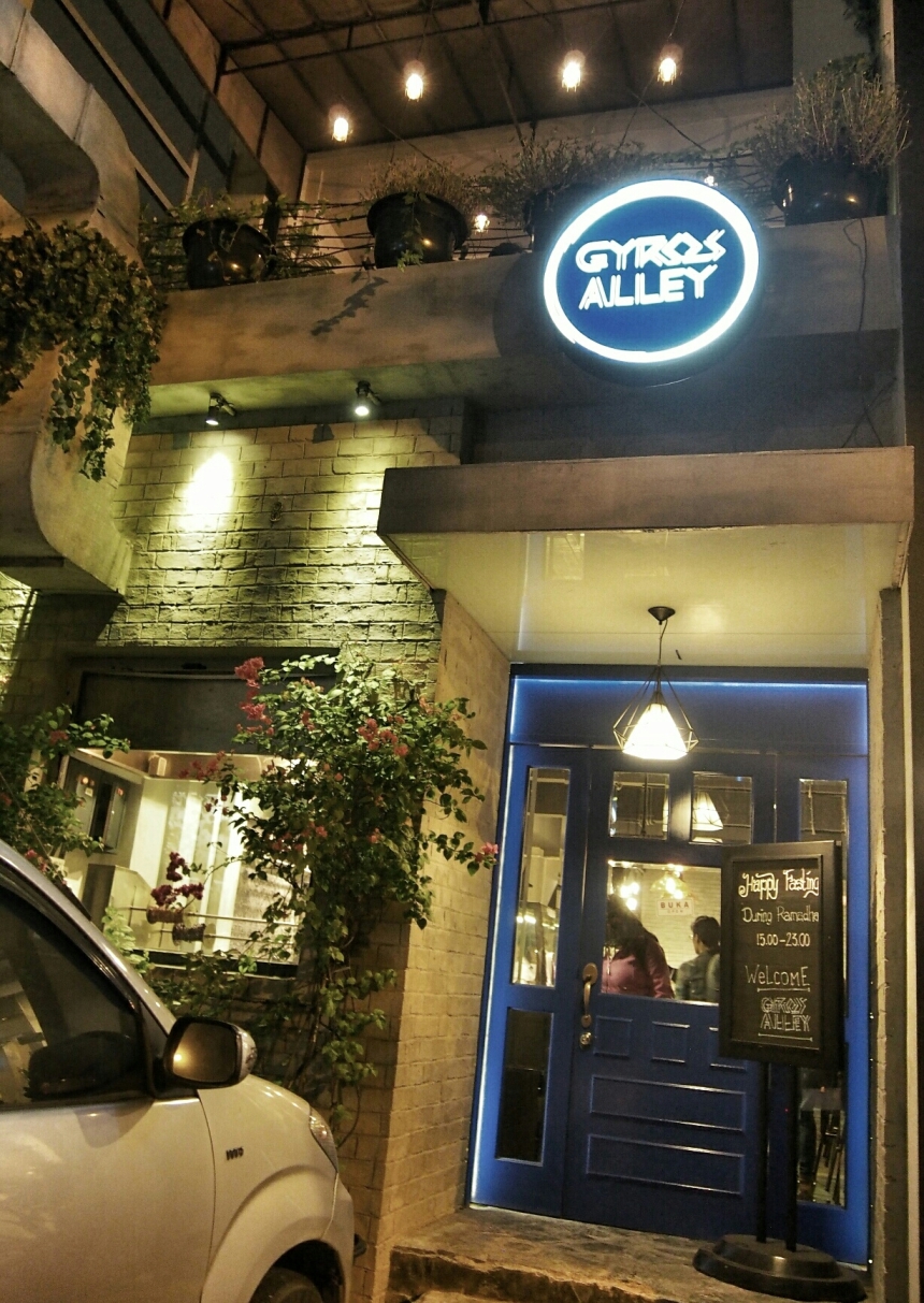 Gyros Alley terdiri dari 2 lantai, dengan hiasan mural-mural yang keren di dindingnya. Ada juga poster-poster dan foto-foto yang bikin pengunjung serasa beneran lagi di Yunani. Di Lantai 1 terdapat sofa-sofa yang nyaman dan deretan kursi ala bar yang berhadapan langsung dengan dapur yang berkonsep semi open kitchen.