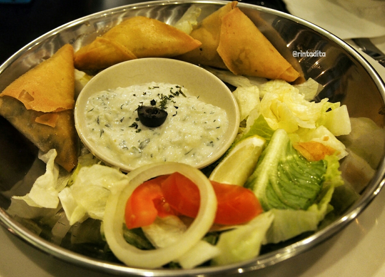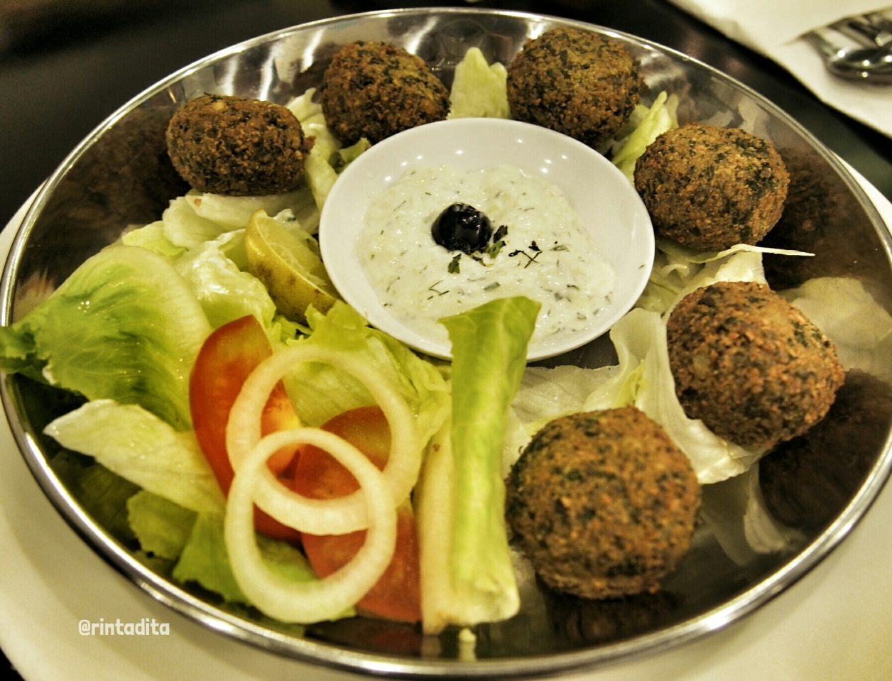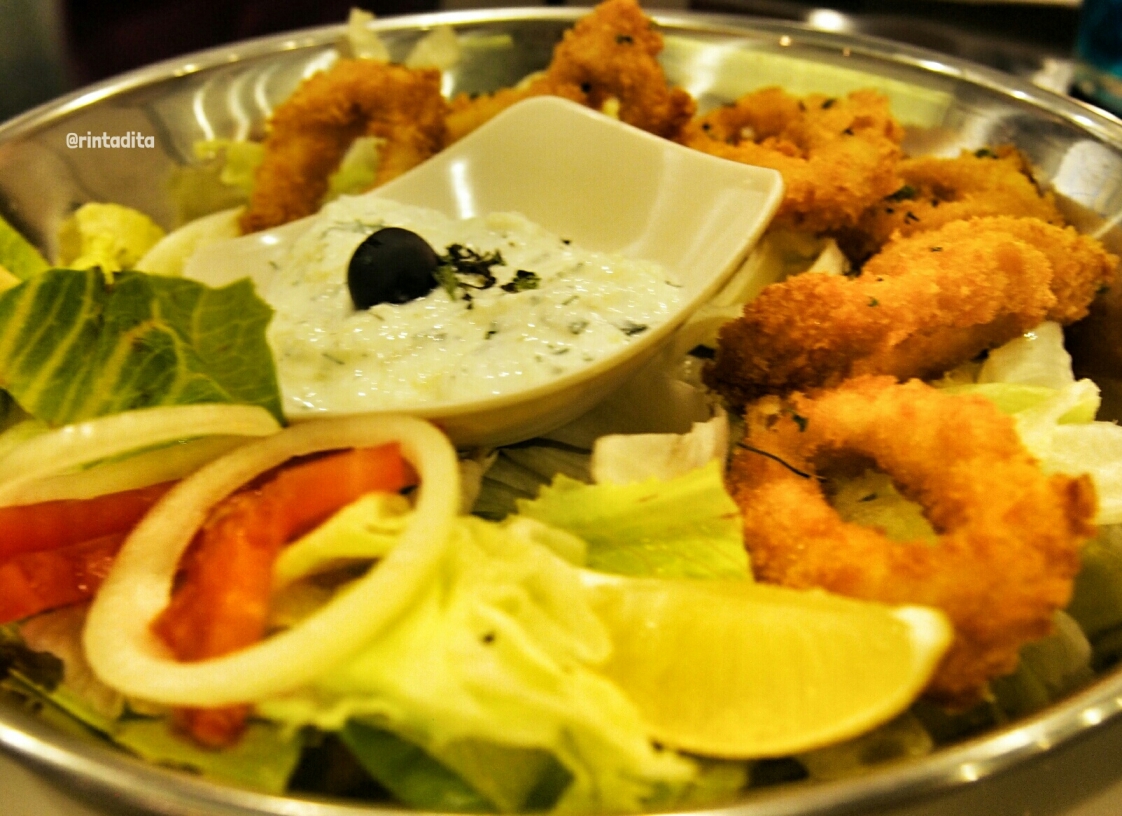 Akhirnya satu per satu makanan dihidangkan. Mulai dari appetizer yang terdiri dari calamari ring, falafel dan spinakopita. Kalo calamari ring sih dimana-mana ada ya, jadi gak terlalu spesial. Bagi yang pernah menyantap hidangan timur tengah pasti sudah tidak asing lagi sama yang namanya falafel. Chickpeas yang dihaluskan, dicampur rempah-rempah trus digoreng. Saya suka banget sama falafelnya, meskipun rasa ketumbarnya cukup kuat tapi menurut saya tetep enak. Sedangkan spinakopita adalah bayam yang dicampur feta cheese kemudian dibentuk segitiga dan digoreng, sepintas mirip samoza namun isinya berbeda. Spinakopita ini juga enak, dan gak bikin merasa bersalah meskipun makan banyak karena isinya kan sayuran 😀 Pokoknya 2 menu ini saya rekomendasikan banget untuk dicoba. Semua appetizer ini dihidangkan bersama salad dengan dipping saus tzatziki yang terbuat dari yoghurt, mentimun dan bawang putih. Rasanya asem-asem lucu gitu, enak dan yang pasti sehat donk.