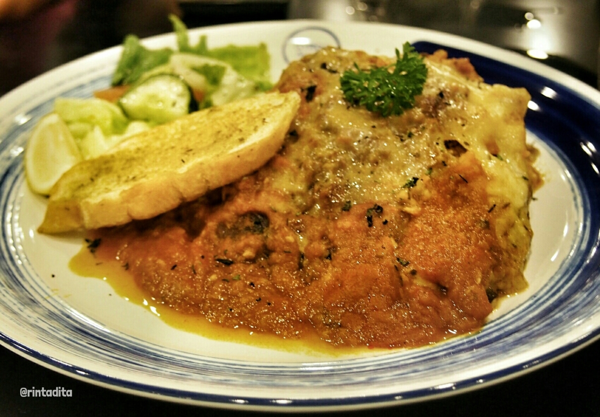 Menu makanan lain yang juga kami coba adalah Beef Mousaka dan Garlic Spaghetti Lamb yang juga tidak kalah enak. Beef Mousaka ini sejenis lasagna ala Yunani, rasanya unik kaya rempah tapi enak. Ini juga salah satu menu yang direkomendasikan kalo ke sini. Sedangkan Garlic Spaghetti Lamb ini enak karena dagingnya gak berasa kambing sama sekali, entah gimana cara masaknya ya. Menu ini cocok bagi yang masih ragu-ragu nyobain makanan Yunani, karena citarasanya masih agak universal.