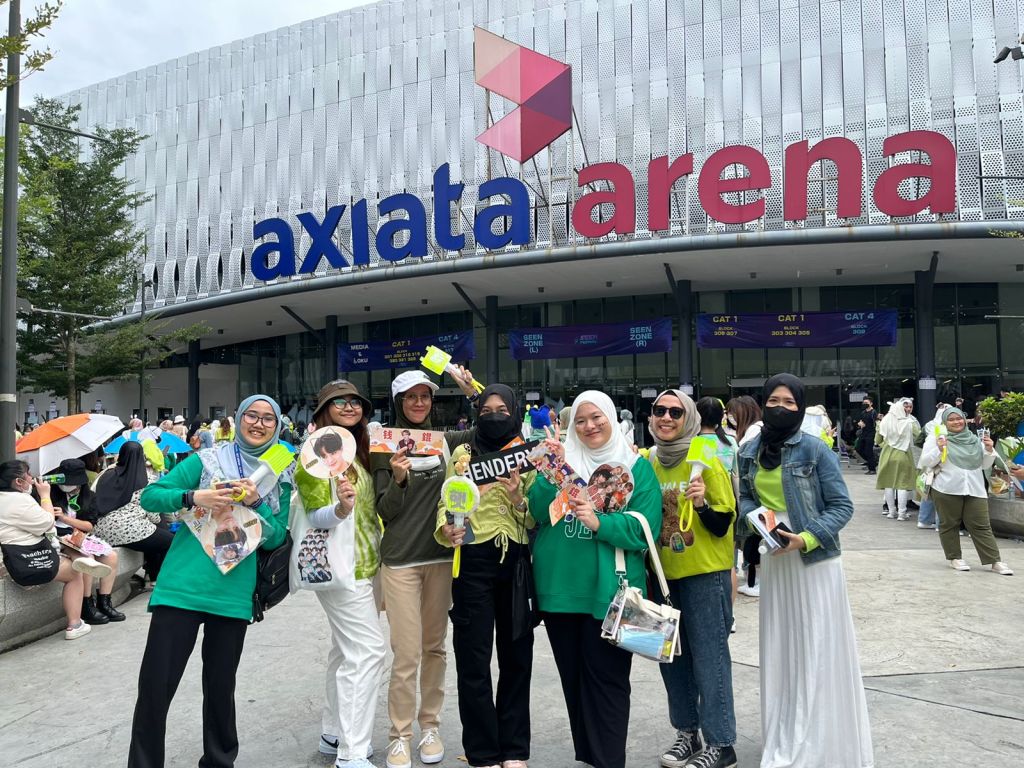 Venue konsernya ada di Axiata Arena Bukit Jalil, kami berangkat ramai-ramai berdelapan orang naik LRT dan sempet nyasar tapi akhirnya sampai juga. Sampai di venue, temen-temen langsung berburu freebies. Jadi di konser Kpop itu emang biasanya suka ada yang bagi-bagi freebies berupa makanan, permen, hand banner, poster, photo card, kipas dan lain-lain. Tapi saya gak ikutan ngumpulin freebies karena males nambah-nambahin bawaan.