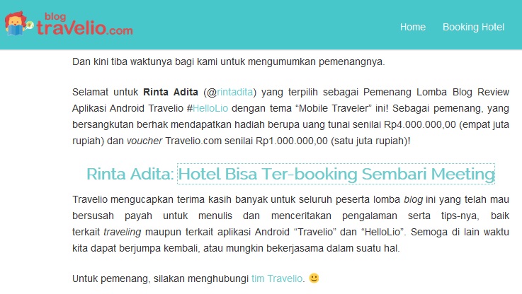 Pemenang lomba blog review aplikasi android Travelio : Hotel Bisa Ter-booking Sembari Meeting