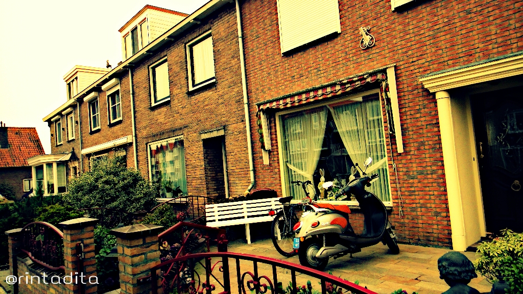 Volendam adalah kampung nelayan yang cantik di pinggiran Amsterdam. Volendam bisa dicapai dari Centraal Station dengan menaiki bus EBS Waterland nomor 110, 112, 118 dan 373 dengan waktu tempuh sekitar 30 menit. Bus EBS ini gak termasuk tiket OV Chipkaart atau GVB Card yang biasanya digunakan untuk keliling kota Amsterdam, jadinya harus beli tiket lagi *mewek*. Tarif bus EBS Waterland ini seharga 10 EUR untuk one day pass, jadi pastinya akan lebih menguntungkan kalo perginya pagi-pagi biar bisa keliling Volendam – Edam dan Marcken. Berhubung berangkatnya udah kesiangan, jadinya kami gak sempet mampir ke Edam yang merupakan sentral pembuatan keju dan klompen *hiks*. Begitu turun dari bus, kami langsung disambut bangunan-bangunan rumah Volendam yang cantik dengan dengan jendela yang besar dan pagar yang tidak terlalu tinggi. Rata-rata di depan rumah terdapat skuter atau sepeda yang terparkir dengan manis. Aaaaak rumah cantik dan skuter adalah perpaduan yang keren, sepertinya damai banget tinggal di Volendam.