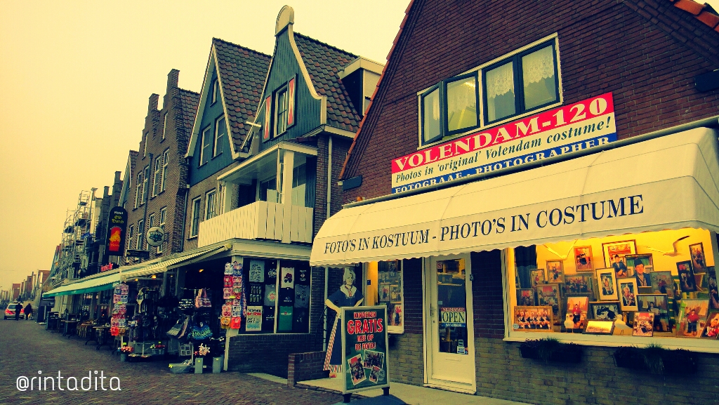 Selain sebagai kampung nelayan, Volendam juga terkenal sebagai tempat belanja berbagai macam souvenir khas Belanda yang murah meriah. Tapi berhubung kami memang gak mampu mau belanja souvenir jadi ya cuma foto-foto aja. Oiya satu lagi yang populer di Volendam adalah foto dengan kostum tradisional Belanda. Disini kita akan didandani dengan kostum dan aksesoris lainnya untuk berfoto dengan background nuansa Belanda. Tarif foto disini bisa berbeda-beda untuk masing-masing studio. Tapi berdasarkan browsing sana-sini, katanya yang paling murah adalah studio foto yang namanya “foto de boer”, price listnya bisa dicek disini, pake bahasa Belanda dan entah update atau enggak :D. Sebenernya kalo cuma pengen foto kayak gini sih gak perlu jauh-jauh ke Volendam, di HEMA resto Kemang Pratama, Jakarta juga bisa. Hasilnya pun gak jauh beda, info lebih lengkapnya bisa diintip disini. Jadi berdasarkan pertimbangan tersebut dan program pengiritan karena ini masih hari ke 3 dari trip, maka kami memutuskan untuk gak foto disini 😀