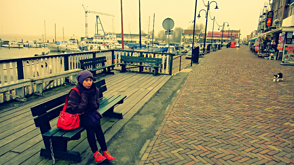 Fotonya nampak lagi kedinginan yah?! Padahal itu cuma pura-pura kok, aslinya sih gak dingin cuma dingiiiiiiin bangeeeeeeet *guling-guling*. Waktu itu thermometer menunjukkan angka -1 derajat celcius, kebayang donk. Sebagai anak tropis yang manis, sudah tentu saya merasa sangat kedinginan dan jadi kepengen dipeluk Adam Levine *digampar Bebeb*. Tapi demi menuntaskan rasa penasaran terhadap Volendam yang katanya cantik banget itu, saya akhirnya merelakan diri untuk menggigil kedingininan, karena memang beginilah resikonya jalan-jalan pas lagi low season *nenggak tolak angin*.